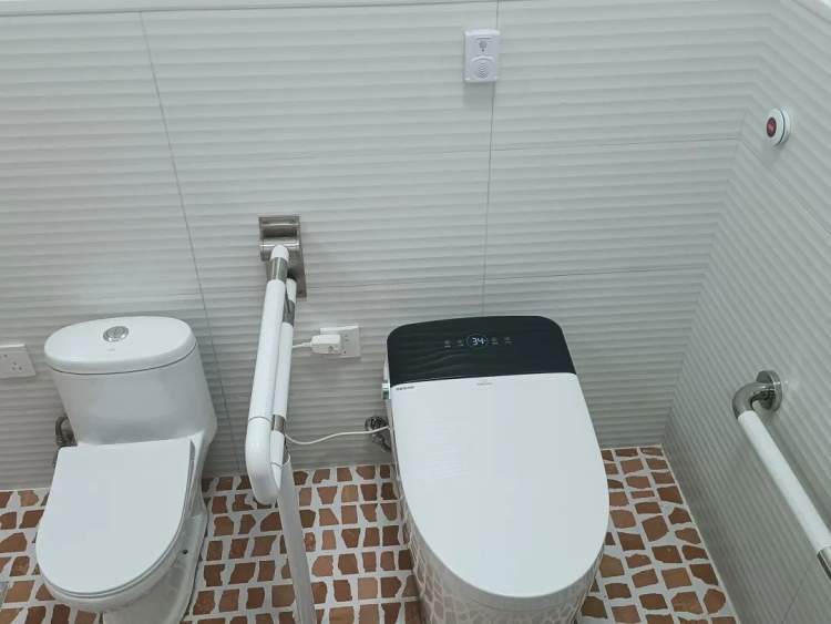 环视整个空间,有扶手、落地小便池、置物架,还布置了防撞护角或防撞条、提示标识等适老适幼设施配置,门口坡道、室内通道及厕间均安装扶手,让老人孩童使用更方便。为了方便特殊人群如厕的需求,男女公厕各设置了两个适老化无障碍厕间。如遇紧急情况,使用者可通过墙面上的紧急呼叫器,向公厕保洁人员求助。