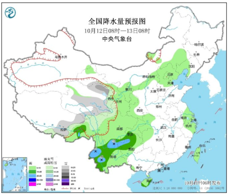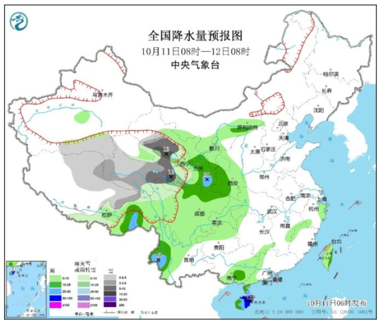 预计今天,青藏高原中东部雨雪天气迎来最强时段,西藏北部和东部、青海大部、甘肃祁连山区、川西高原北部、新疆南疆南部山区等地部分地区有小到中雪或雨夹雪,其中青海东部局地有大雪或暴雪(10-12毫米);西藏东南部、甘肃南部、云南西部、四川北部等地部分地区有中到大雨。