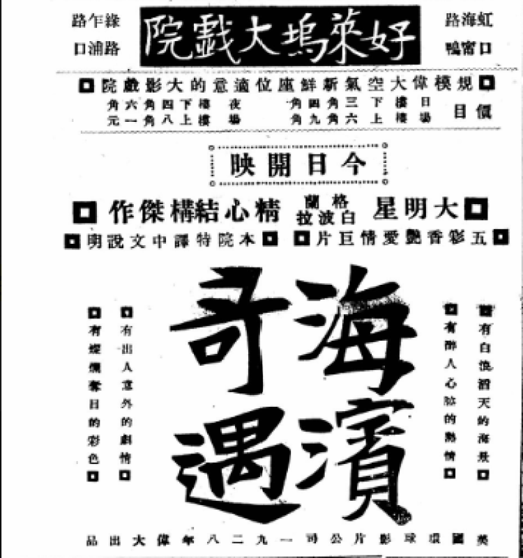 得知胜利电影院即将开业,海派文献研究工作者、闵行区图书馆副研究员孙莺通过老报纸,专门查询了当年这栋老建筑放映的第一部影片:“最初这里叫好莱坞大戏院,1929年2月10日放映了第一部影片,片名是《海滨奇遇》 。”