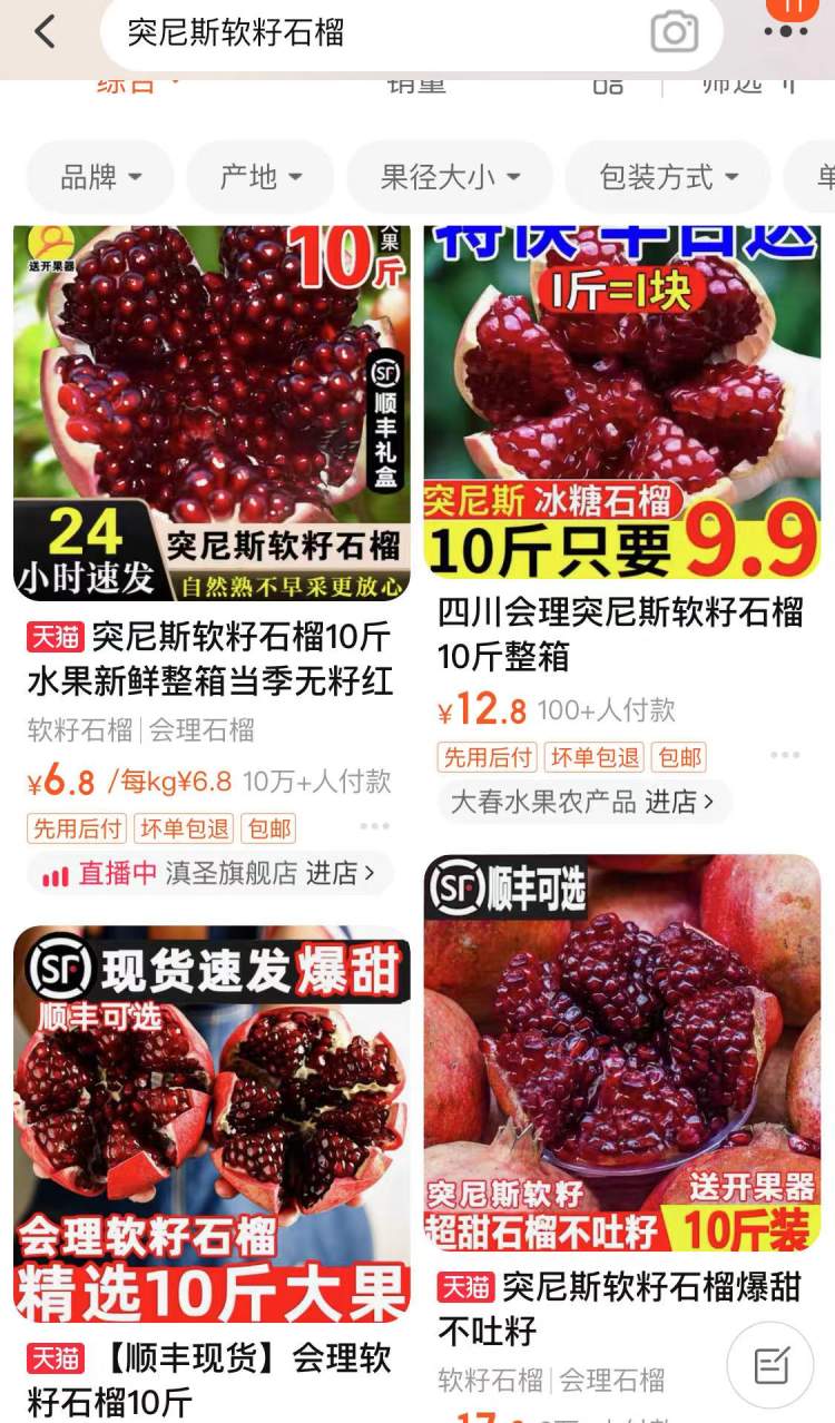 电商平台上,产地直发的突尼斯软籽石榴更便宜。其中一家店铺,中果5斤装只要13.8元,大果5斤装14.8元,算下来平均一斤不到3元。其他店铺,单果300-400克的中大果价格多在4元左右一斤。