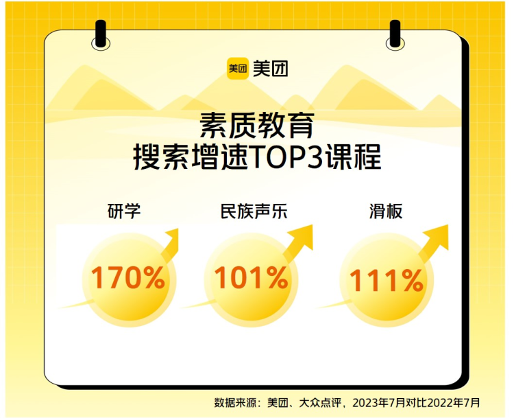 美团、大众点评数据显示,今年以来,平台上“夜校”的搜索量同比增长980%,相关笔记评价数同比增长226%。以今年7月为例,研学、民族声乐、滑板等细分课程的搜索量同比翻倍增长,分别位居增速前三位。