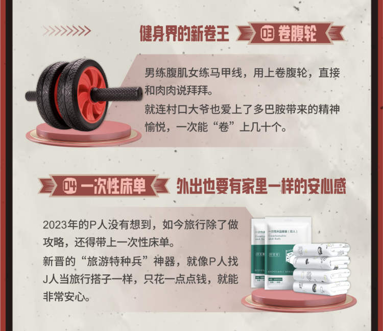 同一时期,运动健康已经成为消费主旋律,自然扩散和渗透到了县域消费市场。一方面主动健身,一方面主动预防,左手卷腹轮、运动健身衣,右手一次性床单等出行四件套。