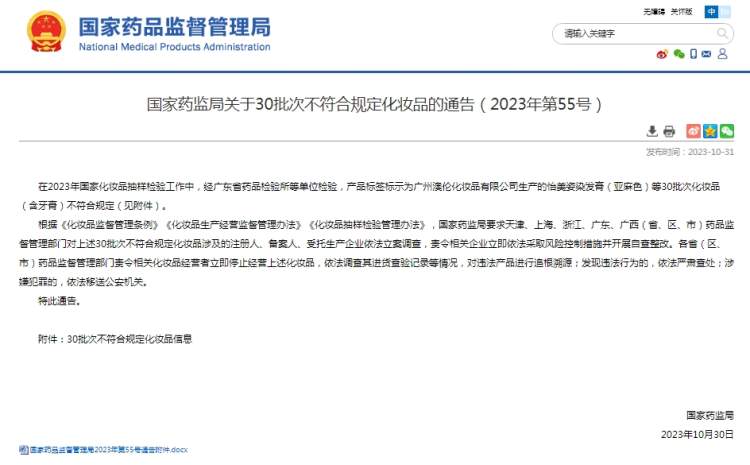 据国家药监局网站10月31日消息,国家药监局发布《关于30批次不符合规定化妆品的通告(2023年第55号)》。《通告》称,在2023年国家化妆品抽样检验工作中,经广东省药品检验所等单位检验,产品标签标示为广州澳伦化妆品有限公司生产的怡美姿染发膏(亚麻色)等30批次化妆品(含牙膏)不符合规定。
