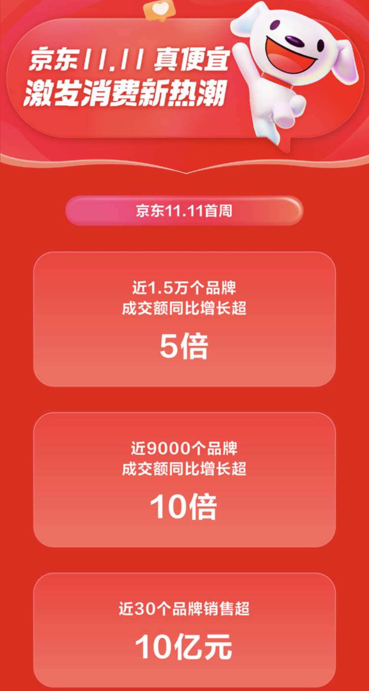 京东11.11首周,近30个品牌销售超10亿元,近1.5万个品牌成交额同比增长超5倍,近9000个品牌成交额同比增长超10倍。