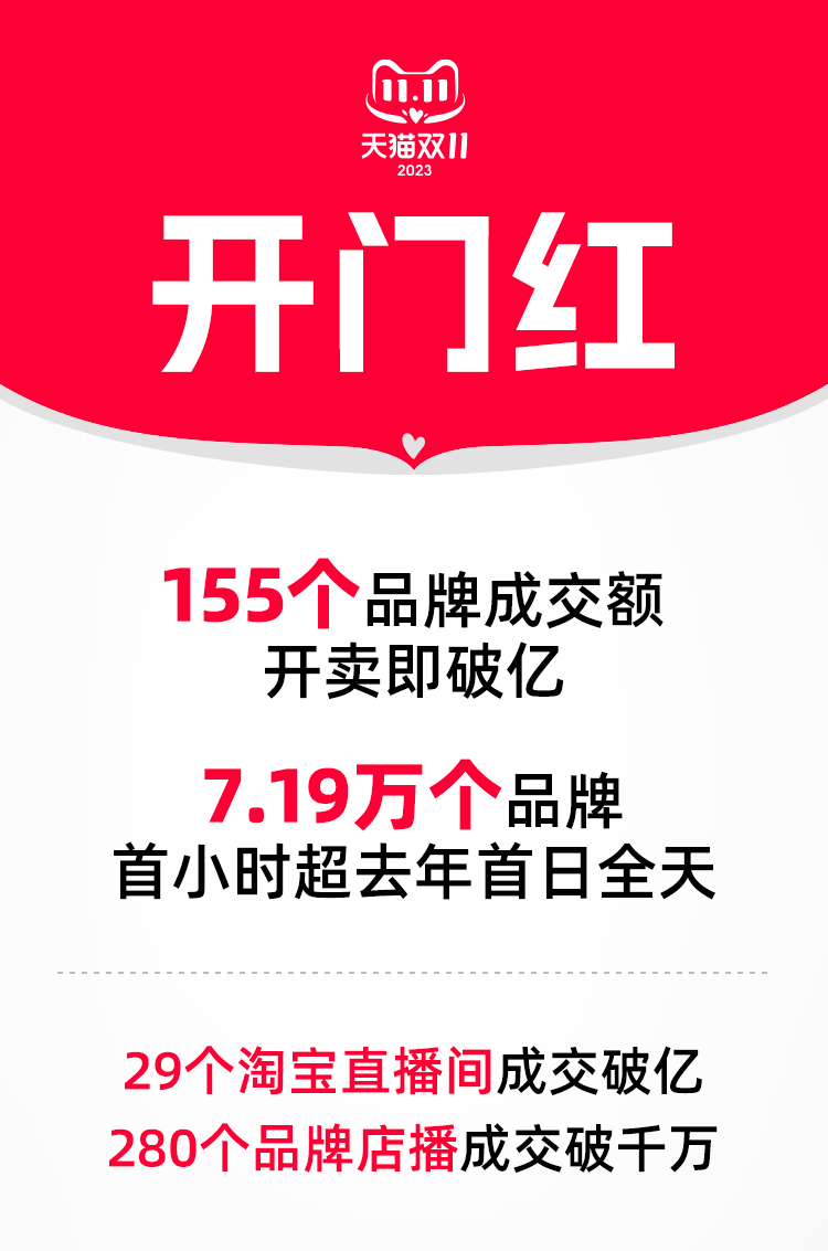 10月31日晚8点天猫双11正式开售,155个品牌开卖成交即破亿,首小时7.19万个品牌成交额超去年首日全天。