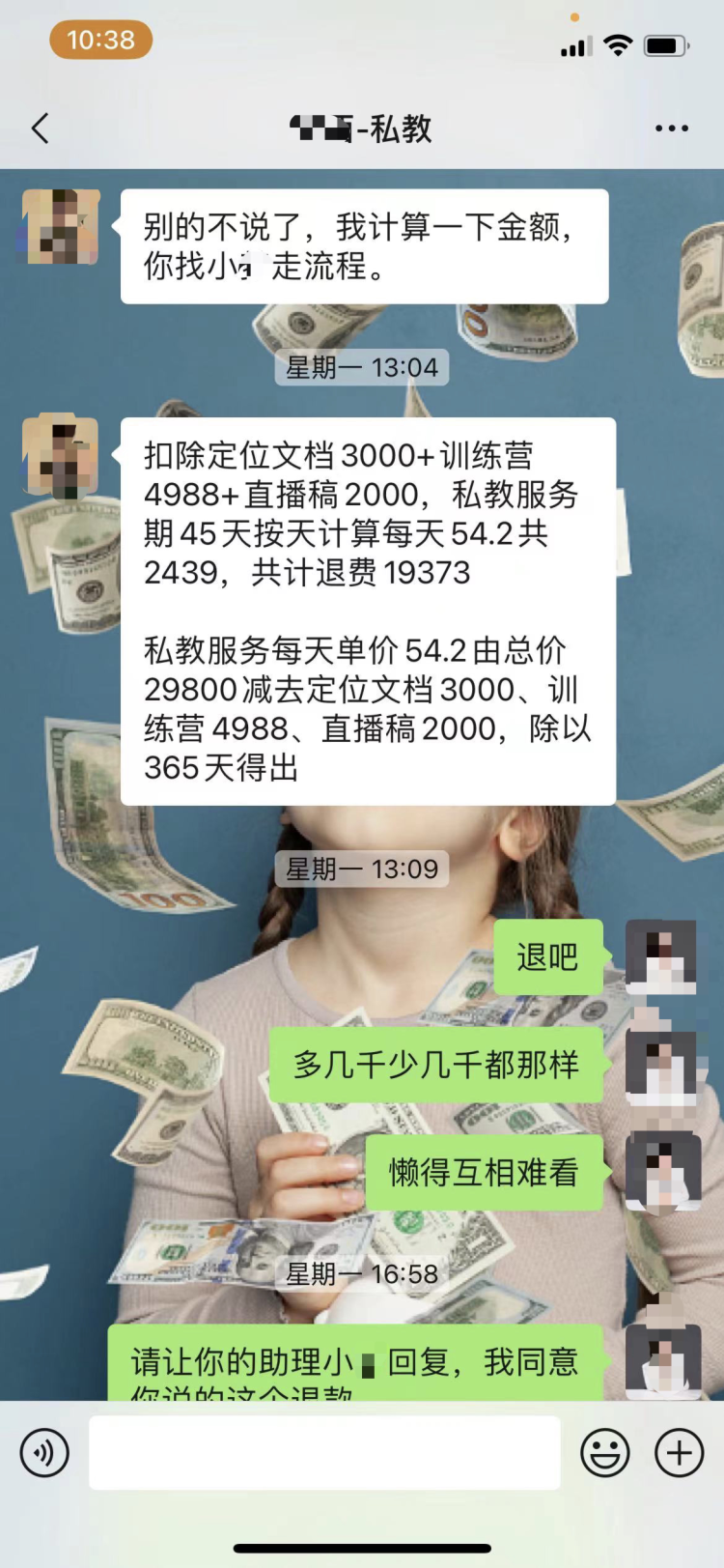 5xx9说,目前“MM妈妈”训练营几千个人的交付,每天都是正常进行的。不认可的就签署了退费流程,正常退费,十一月都会退款到位的。不能正常上课、被踢出来的人,一共大概11个人。暂停这几个人的退费,运营说有两个考虑,一方面是已经起诉了带头的吴X等人,因为名誉侵权等确实给老师和他们公司带来的巨大负面影响,一方面是之前和他们闹的人也是正常退费,但这些人拿到退款后,就跟其他人说,只要骂老师就可以退款,导致骂老师成风,也无法退款。