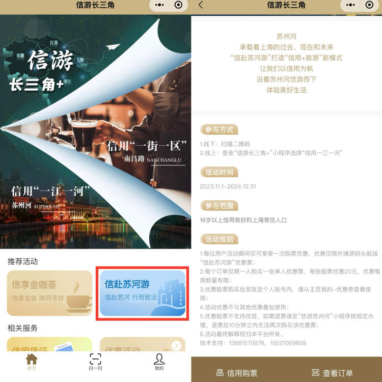 凡18岁以上信用良好的上海常住居民,通过微信搜索进入“信游长三角+”小程序,点击“一江一河”,或者微信搜索“悠游苏州河”小程序点击上方“信赴苏河游”图片,均可参与优惠活动。