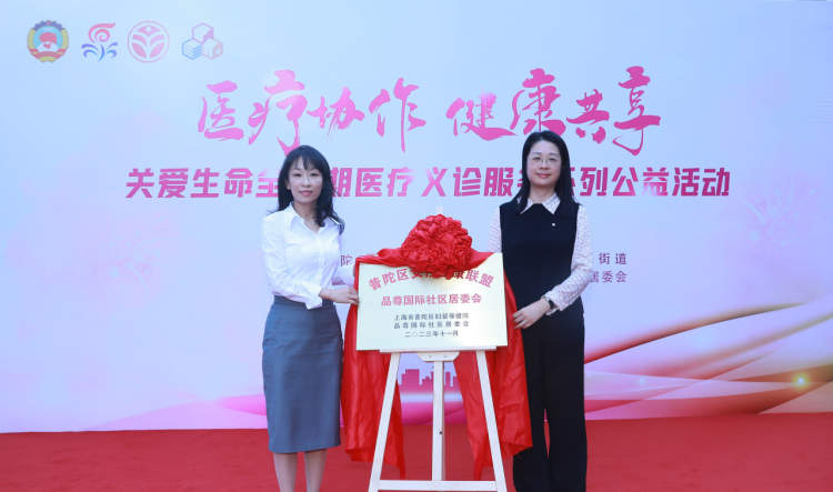 靳文娟与林夏荫共同为“普陀区女性健康联盟——品尊国际社区居委会”揭牌。品尊国际社区居委会正式加入由普妇婴牵头成立的普陀区女性健康联盟。
