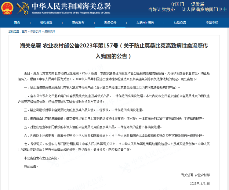海关总署 农业农村部公告2023年第157号(关于防止莫桑比克高致病性禽流感传入我国的公告)