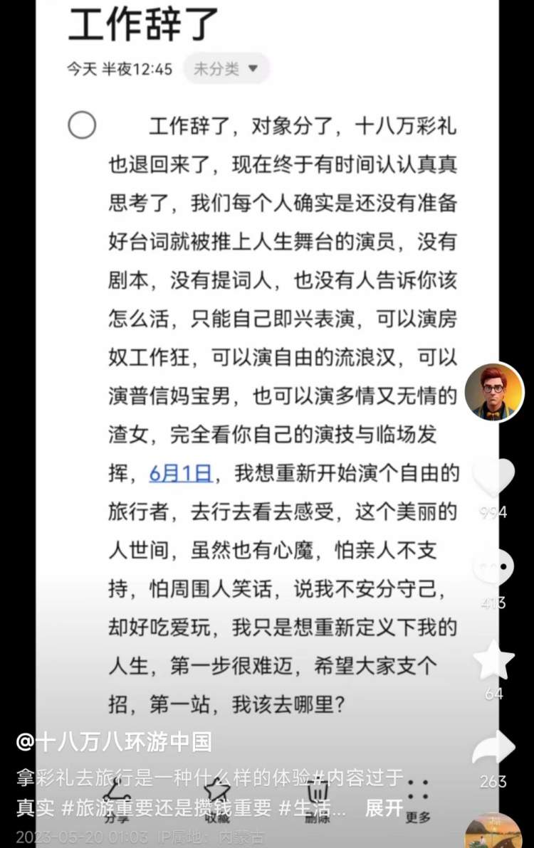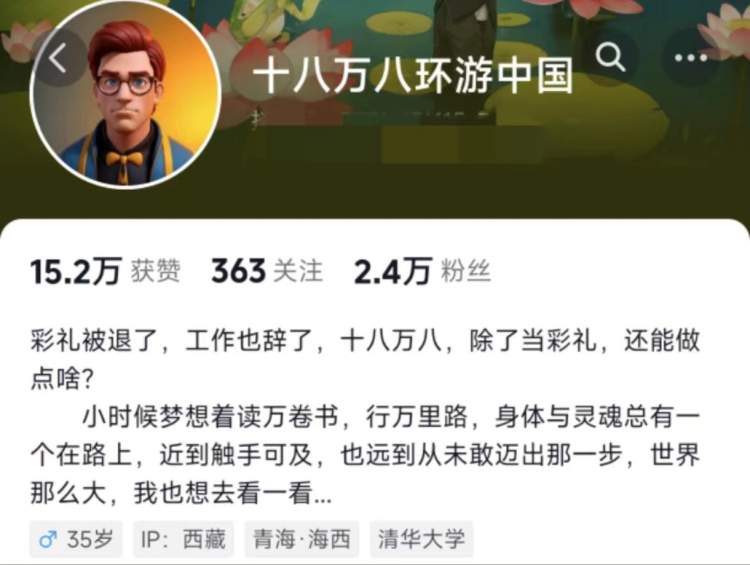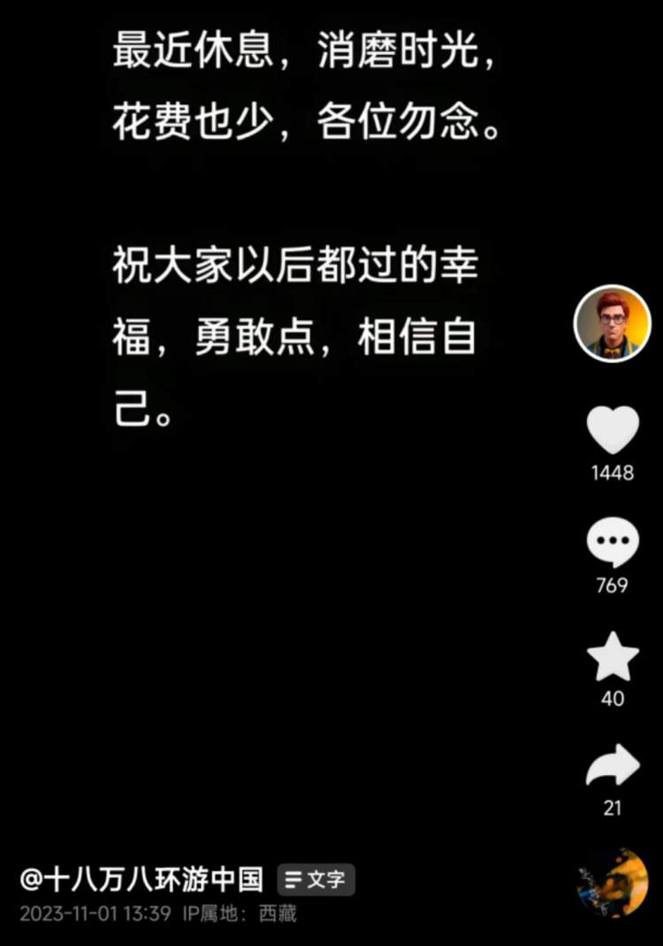 如果他的感受是,在出游过程中疗愈了内心的伤痛,看到了不一样的风景,充实了心灵,让自己重新鼓起勇气,走向人生的下一阶段,那么这次出游就是值得的。但他没有,他还在迷茫中。
