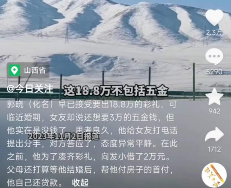 退婚,辞职,把彩礼钱变成旅费……郭晓把他的故事和旅程发在抖音上,引来众多网友围观。但他的心中充满苦涩,他说,自己本已接受18.8万彩礼,临近婚期,女友执意要加3万元五金钱,成了压垮婚事的最后一根稻草。“我实在是没钱了,思考良久,决定逃离。”在此之前,他为了凑齐彩礼,还向发小借了2万元。