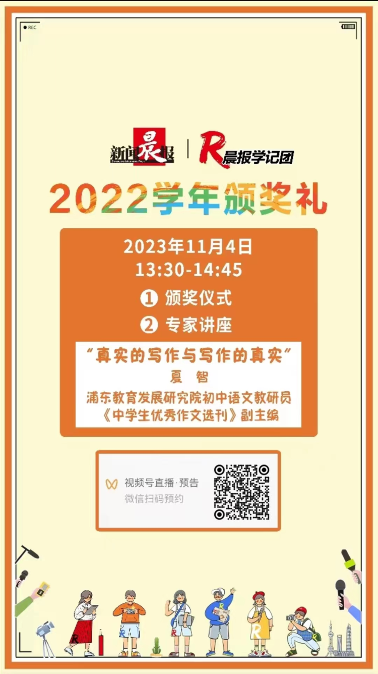 11月4日下午13:30分,在第24个记者节前夕,我们将在晨报学记团桃浦记者站举行颁奖礼,表彰新闻晨报学记团2022学年最佳小记者、优秀小记者、年度采访之星和写作之星,以及新闻晨报学记团桃浦记者站2022学年优秀小记者。