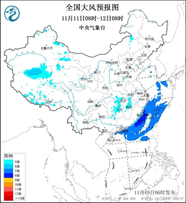 11月11日08时至12日08时,安徽南部、湖北中东部、湖南大部、江西中北部、广西东北部以及福建沿海、广东东部沿海、台湾岛沿海等地有5~6级、阵风7~8级的大风;东海大部海域、台湾海峡、台湾以东洋面、南海北部海域、巴士海峡偏北海域将有7~8级、阵风9~10级的大风。