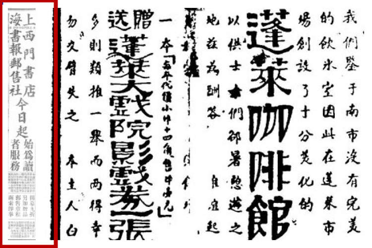 上海西门书店兼营咖啡广告、蓬莱咖啡馆的广告
