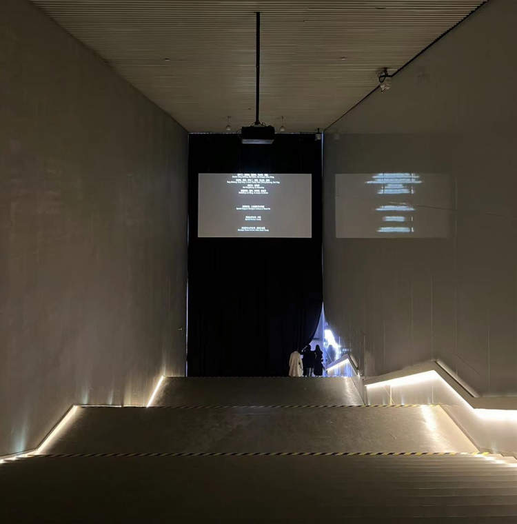 大台阶是展览的结尾,黑色垂幕掀起一角,上面的制作团队名单,正如电影结尾的演职人员名单一样滚动播放,充满仪式感。
