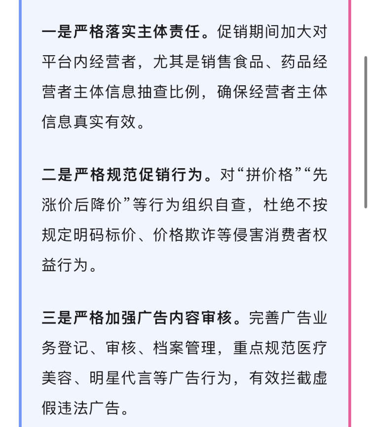 一是严格落实主体责任。促销期间加大对平台内经营者,尤其是销售食品、药品经营者主体信息抽查比例,确保经营者主体信息真实有效。