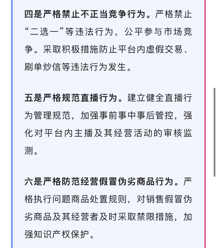 四是严格禁止不正当竞争行为。严格禁止“二选一”等违法行为,公平参与市场竞争。采取积极措施防止平台内虚假交易、刷单炒信等违法行为发生。