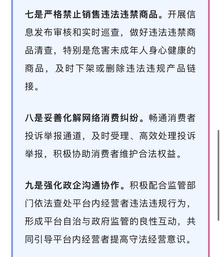 九是强化政企沟通协作。积极配合监管部门依法查处平台内经营者违法违规行为,形成平台自治与政府监管的良性互动,共同引导平台内经营者提高守法经营意识。