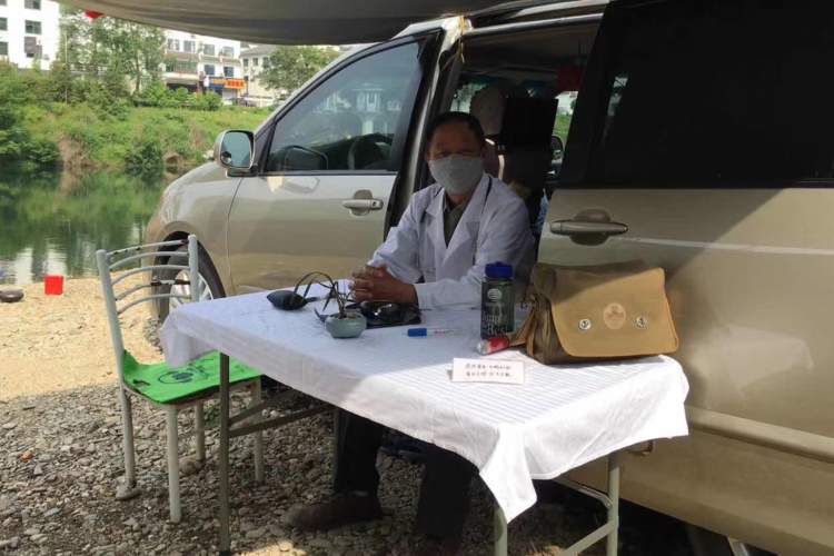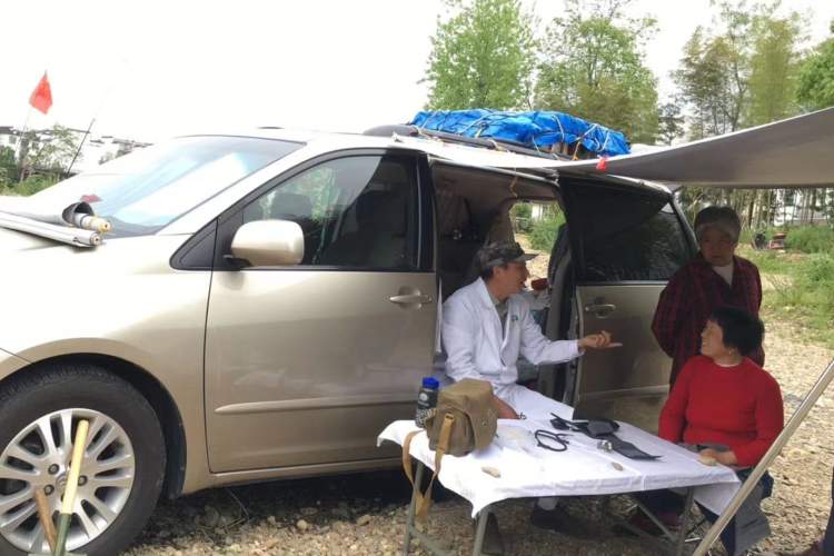 行车至某处安营扎寨后,李孝贵总是顾不上旅途劳累,展开旗帜固定在车身上,然后打开折叠桌椅,穿上白大褂,义诊就此拉开序幕。