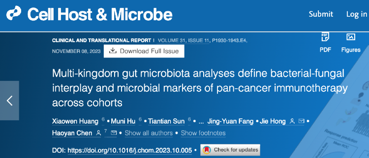 11月8日,上海交通大学医学院附属仁济医院消化科陈豪燕和洪洁团队在Cell子刊《细胞·宿主与微生物》(Cell Host & Microbe,IF:30.3)以推荐论文形式在线发表重要研究成果,首次揭示了肠道真菌谱具有预测肿瘤免疫治疗疗效的作用,且肠道真菌预测准确性更高。该研究为筛选肿瘤免疫治疗的应答者,从而提高免疫治疗的适用性提供了新思路。