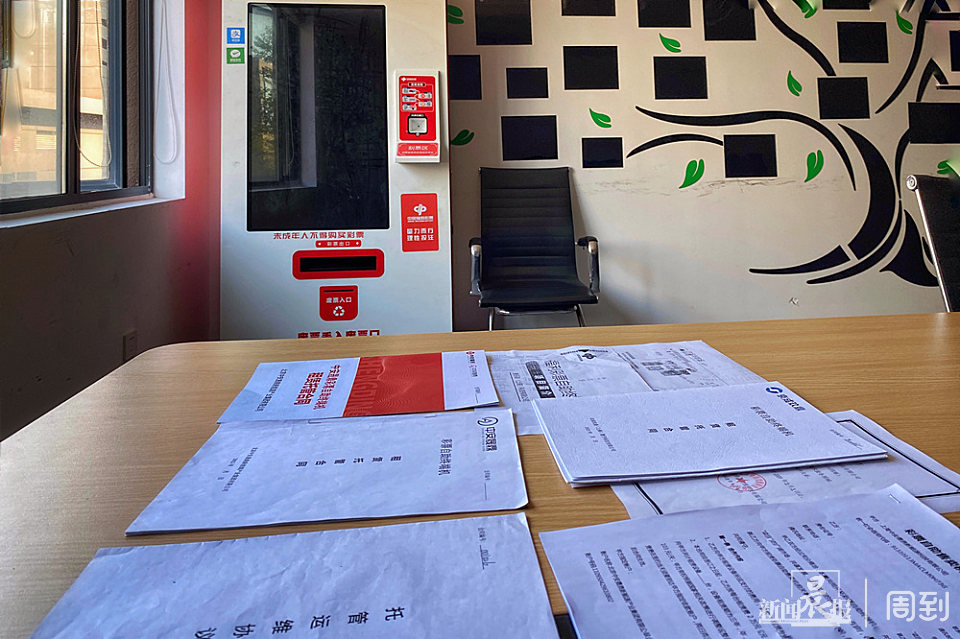 从一楼、二楼各个房间里可以看到,许多投资彩票机的用户合同都随意地扔在桌上或地上,还有一些七云合亿公司的宣传资料也四处散落,整栋楼只有二楼会议室里有一台标注着“中国福利彩票”字样的机器。