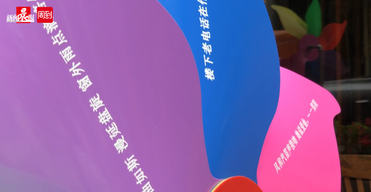 第二件事,我们把永康路东面这段布置成“风车一条街”,呈现出一派秋日的景象,非常热闹。同时呢,我们很多的客人和艺术家在看到风车以后对风车做了二次创作,你可以看到风车背后有一些非常短的一些诗句,这些是摄影家和诗人郑阳创作的。