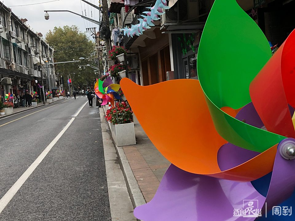 考虑到当天是周末最后一天,记者决定坐地铁前往永康路一探究竟。从12号线嘉善路地铁站出站之后,记者骑了一辆共享单车,沿着嘉善路往北一路骑行。从嘉善路转弯到永康路路口时,记者发现马路两边多了不少彩色的风车,随风转动,时快时慢,走过的女生还会以风车为背景,摆出不同的姿势拍照打卡。