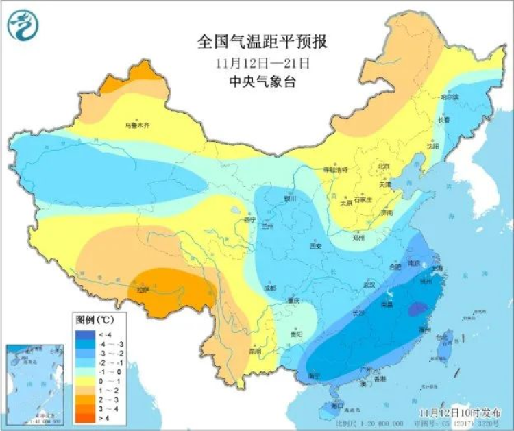 全国来看,11月12-21日有两股冷空气影响我国,冷空气间歇期北方地区气温逐步回升至接近常年或略偏高,南方地区气温持续偏低,西南阴雨日数较多。