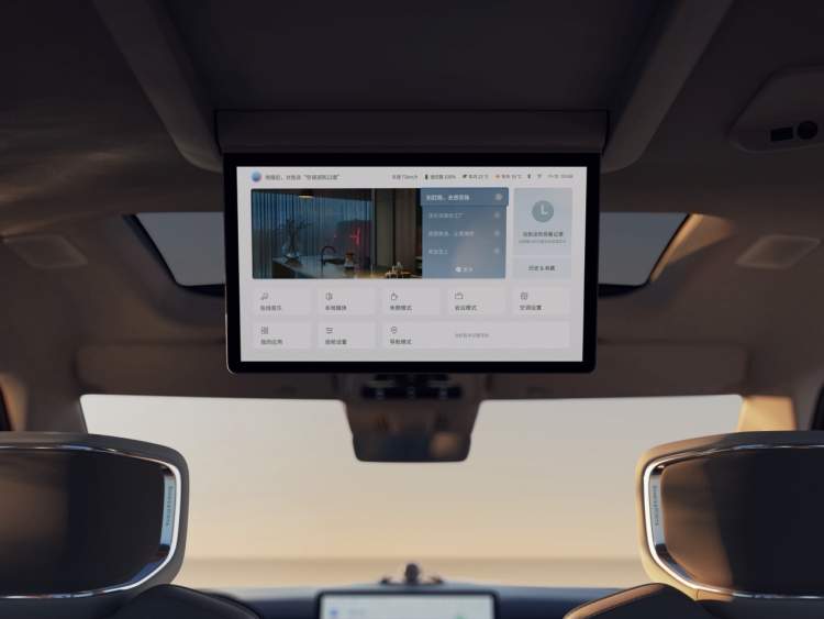 在二排上方的车顶处,还配备一块15.6英寸后舱智慧屏,方便您轻松享受娱乐内容或者参加视频会议。这块屏幕还支持移动投屏和各种第三方应用程序。