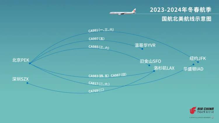 2023年11月30日起,国航北京首都-洛杉矶航线增至每周3班,每周四、五、日执飞。