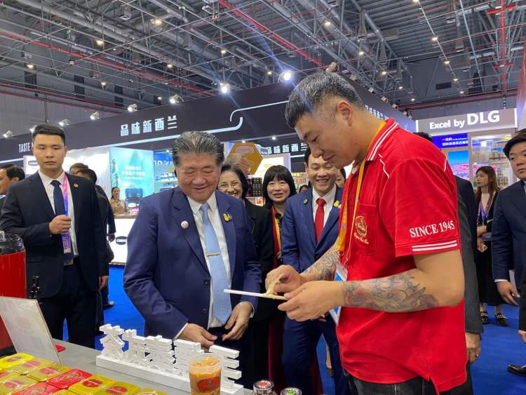 在进博会开幕的第一天,ChaTraMue手标泰式茶展台熙熙攘攘,在众多参观者中有一位特殊嘉宾——泰国副总理兼商务部部长Mr. Phumtham Vejyachai亲临展台,他的莅临令现场气氛达到高潮。Mr. Phumtham Vejyachai亲自品尝了ChaTraMue手标泰式茶的经典泰式茶饮,并表达了对企业未来的美好期许,同时与企业团队亲切交谈,分享茶文化的魅力。