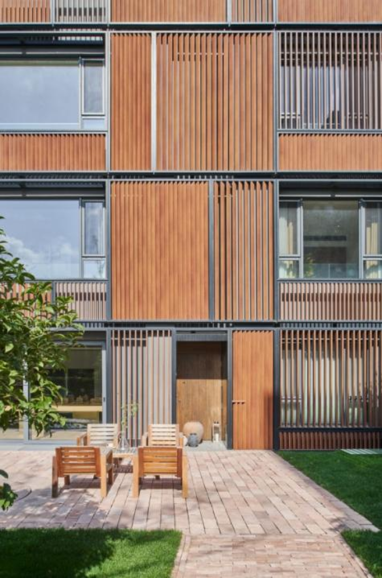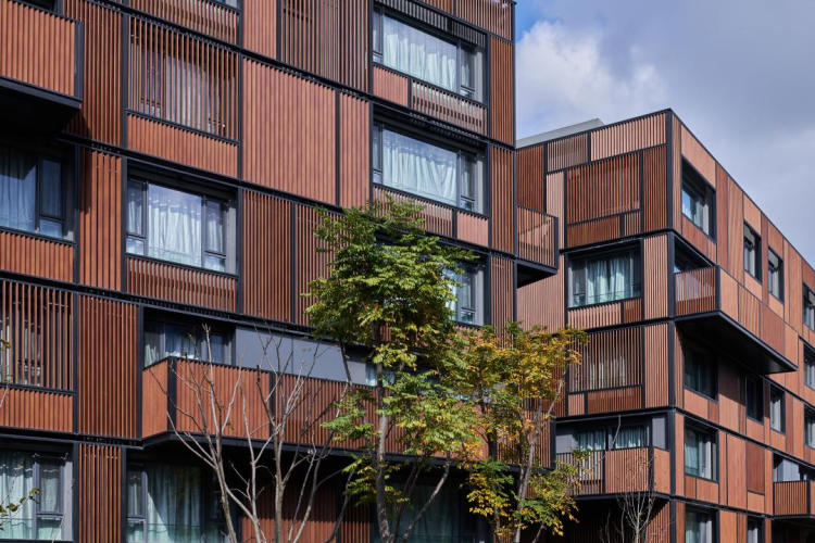 遵循去繁至简的设计理念,沁风雅苑建筑立面采用优雅木色调搭配竖条木纹,生动质朴的色调外形,呈现极简主义的建筑艺术。