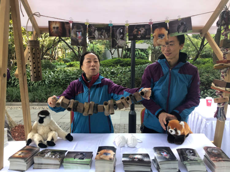 在上海动物园的摊位,饲养员们制作了不少动物玩具,这些其实是动物的丰容工具。比如,给金丝猴的一个玩具,把食物塞在一个个竹节里,让它想办法掏出来吃,增加动脑动手的能力,让动物园的生活更多彩一些。