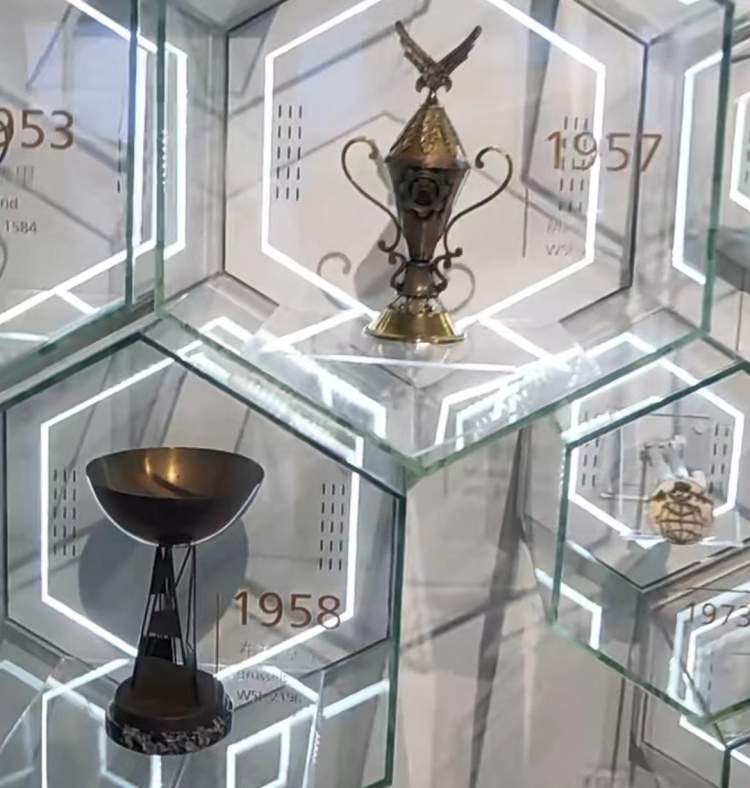 这面墙上展示的是从1950年开始,历届世界技能大赛的奖杯和奖牌。第一届是奖杯,在西班牙的马德里举行的。1957年和1953年、1958年颁发的也是奖杯。