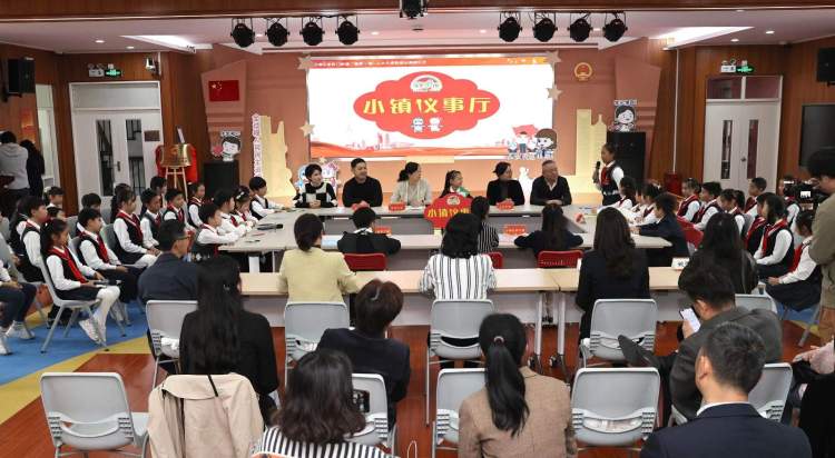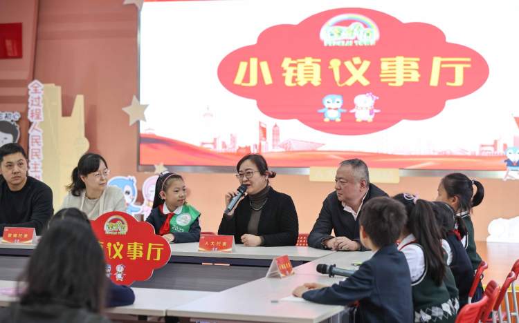 揭牌仪式后,蓬莱路第二小学的同学们用情景剧的形式向现场嘉宾展示了“践行全过程人民民主”的学习成果,并开展了首场“小镇议事厅”活动。