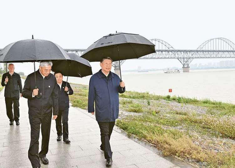 2023年10月10日至13日,中共中央总书记、国家主席、中央军委主席习近平在江西考察。这是10日下午,习近平在长江国家文化公园九江城区段考察时,冒雨沿江堤步行察看沿岸风貌。 新华社记者 谢环驰/摄