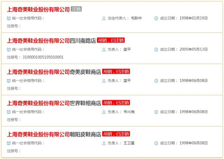 不仅仅如此,上海奇美鞋业股份有限公司关联的4家门店也显示“吊销,已注销。”