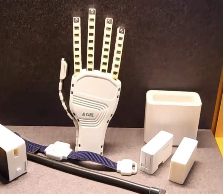 这是一只机械制作的手,它可以通过刺激神经加快中风和脑瘫患者康复的作用。
