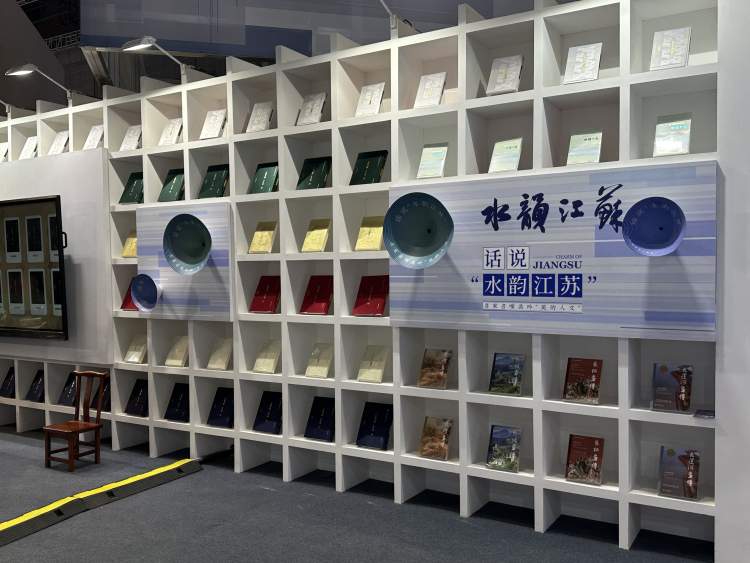 走进展区映入眼帘的是以汉字“省形合文”的构成方式组成的“遇见平江路”合体字设计,背后的大荧幕真实还原苏州平江路历史街区风貌,苏州评弹团现场演奏《苏州好风光》,一旁是苏绣、瓷绣、桃花坞木版年画等江苏非遗产品,观众可以在这里漫游苏式图景,感受江苏水韵生活。