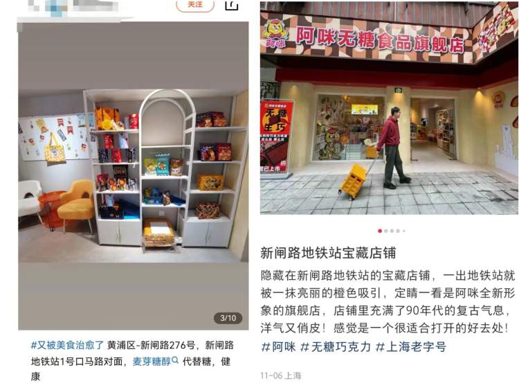 最近,孟女士坐车路过新闸路时,就看到了“熟悉又陌生”的阿咪旗舰店。熟悉的是自己童年吃过无数次的奶糖牌子,不熟悉的是阿咪的店招上居然有许多巧克力。