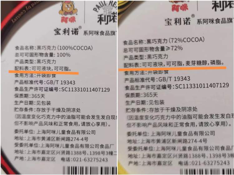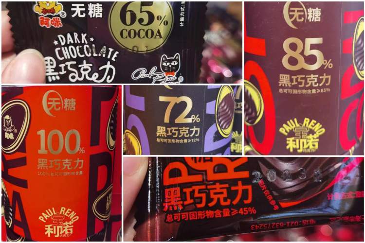 在她看来,这些黑巧克力还有一大优势就是配料表干净,比如总可可固形物含量大于等于72%的配料表为可可液块、麦芽糖醇、可可脂、磷脂四种;而到了总可可固形物含量100%的黑巧,配料表只剩下可可液块、可可脂两种。“没有那种名称特别长看也看不懂的食品添加剂,吃起来更纯粹一点。”