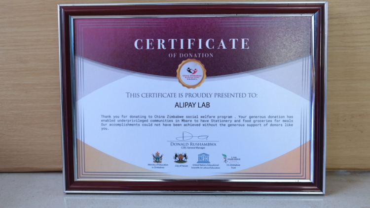 CZEC副主席刘龙代表哈拉雷市政府、教育部、联合国教科文授予支付宝空间站公益证书。