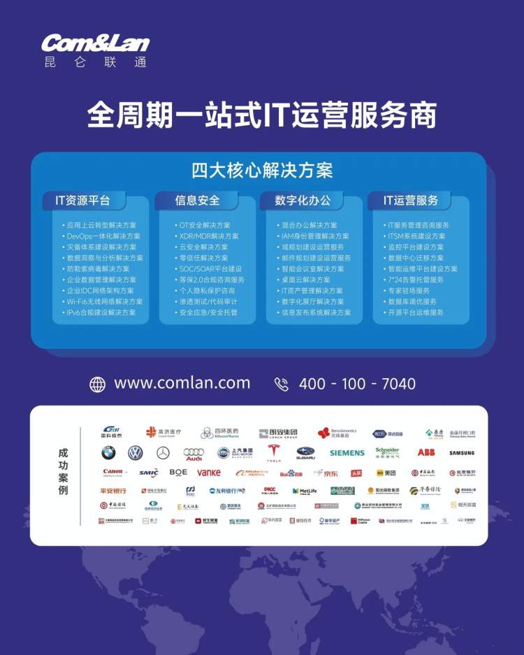 作为一家全周期一站式IT运营服务商,上海昆联秉持初心、不忘使命,始终坚持以用户为中心的服务理念,以专业的水准和20余年的行业头部用户技术积淀,为客户提供咨询规划、技术落地、运营优化,致力于“让IT更简单,让业务更安全”,大幅降低客户选择成本、测试成本,减少试错风险,降本增效,加速转型,助力IT驱动业务快速发展。