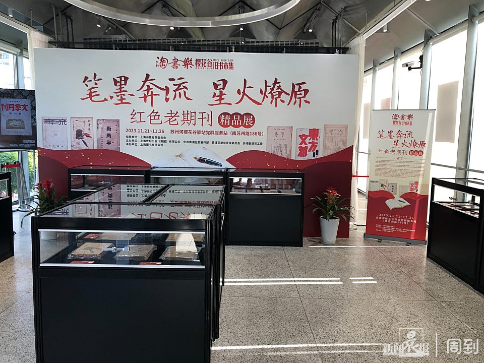 本次市集活动特别设计了一个展览和一个展示区域。“笔墨奔流·星火燎原”红色老期刊精品展精选上海图书公司所藏如《向导》《朝花》《奔流》等红色主题老期刊40余种,还请著名老期刊、旧平装版本专家陈克希录制了讲解视频。