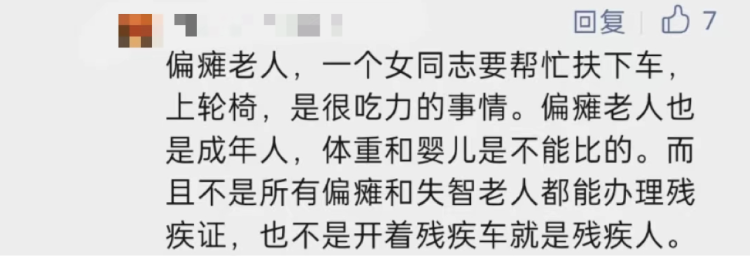 还有一些网友提出,老人、残疾人坐轮椅出门的确存在不便,且也不是所有偏瘫老人都能申请残疾证,希望社会对此多一些关注: