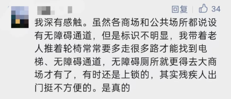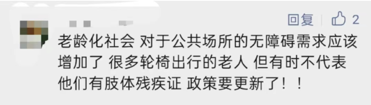 “老龄化社会,对于公共场所的无障碍需求应该增加了,很多轮椅出行的老人,但有时不代表他们有肢体残疾证。”