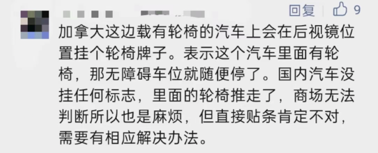 “是否能出台个政策,家里有行动不便的人时可以申请一个挂牌挂在车内,这样停在无障碍车位时从外面也能清楚辨认。”
