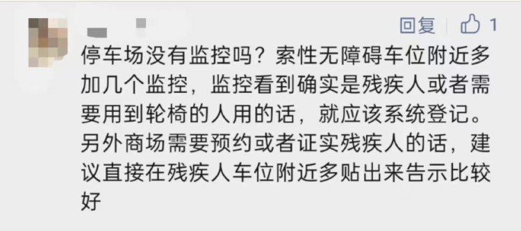 “索性无障碍车位附近多加几个监控,监控看到确实是残疾人或者需要用轮椅的人用的话,就应该系统登记。另外商场需要预约或证实(是)残疾人的话,建议直接在残疾人车位附近多贴出来告示比较好。”