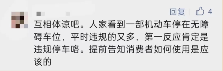 “互相体谅吧。人家看到一部机动车停在无障碍车位,平时违规的又多,第一反应肯定是违规停车咯。提前告知消费者如何使用是应该的。”