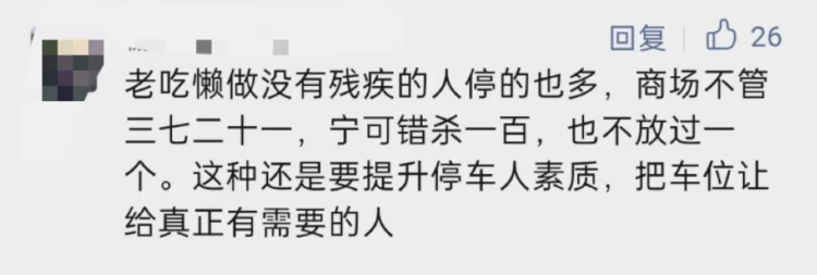 “老吃老做没有残疾的人停的也多……这种还是要提升停车人素质,把车位让给真正有需要的人。”